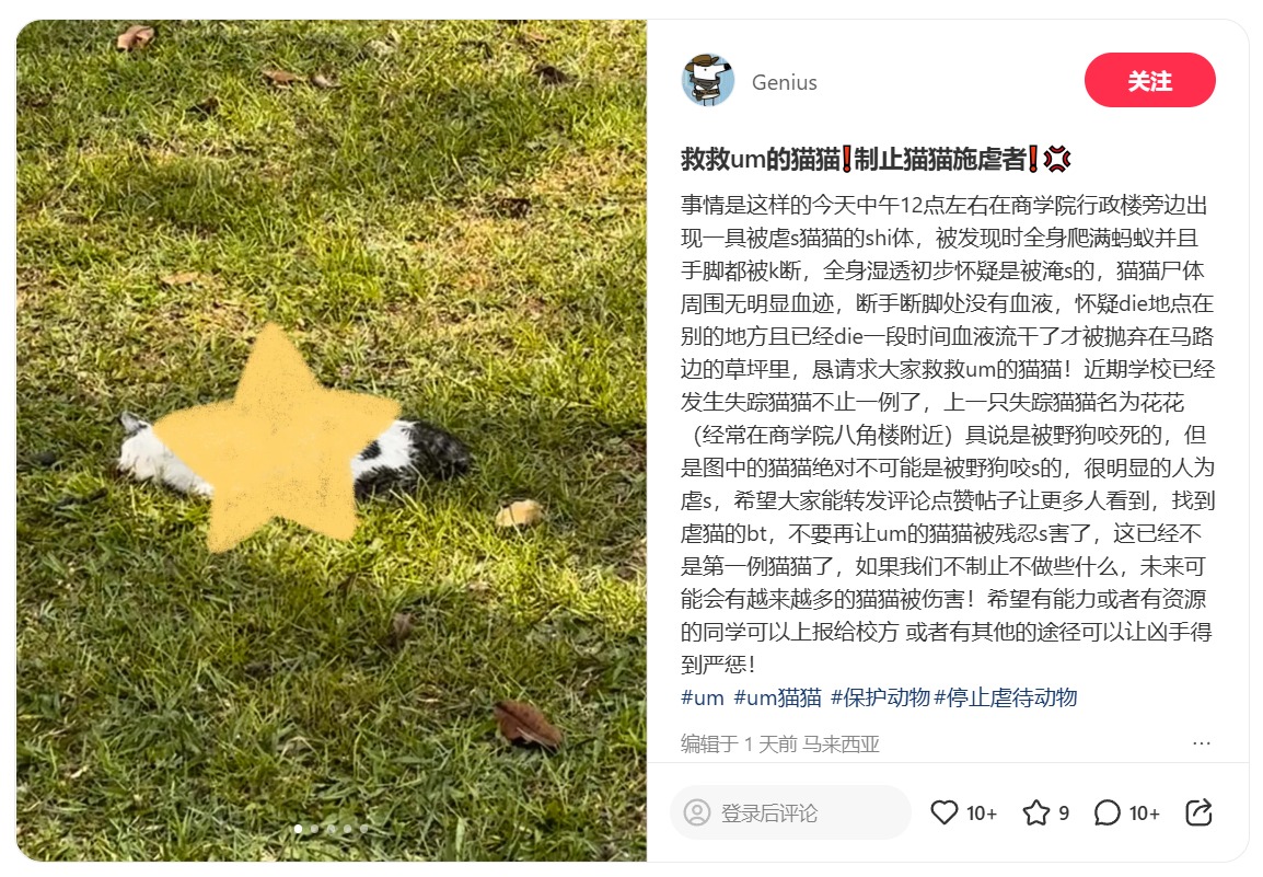 一位账号署名为“Genius”的小红书用户,于12月16日发布一则标题为“救救um的猫猫!制止猫猫施虐者!”,并附上一具猫尸及其生前的照片。