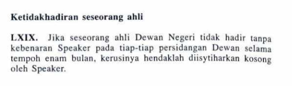《1959年雪州政府体制法》第69条文阐明,如果有议员连续6个月缺席议会,州议长就必须宣布该议席悬空。(截图自《1959年雪州政府体制法》)