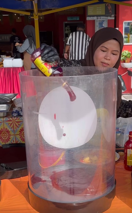 该名小贩近日在面子书上传一段1分30秒冲泡草莓奶昔冰饮的视频,从画面中可见,一名女子将两瓶草莓浓缩果汁倒入一个空的透明塑料桶中,然后加入两大壶热水,以快速溶解浓缩果汁。