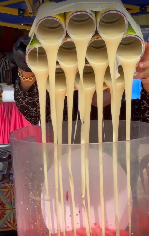 接着重头戏来了,女子将10罐用胶带捆绑在一起炼奶,全部倒入大桶中,随后使用大勺子将桶内的果汁和炼奶搅拌均匀,再加入两大包冰块。