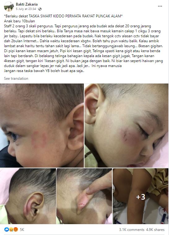 这名父亲扎卡力亚(Bakti Zakaria)在面子书发文,痛心讲述孩子在托儿所的遭遇。