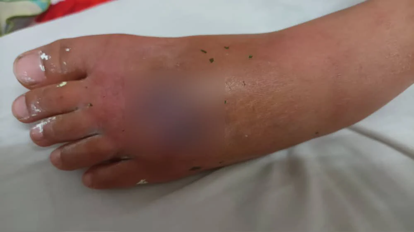 因被石头砸伤,女童左脚红肿疼痛,触目惊心。