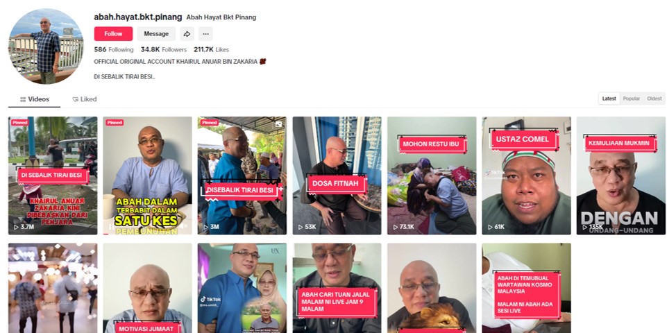 凯鲁安华的TikTok账号“武吉槟榔终生监禁犯爸爸”(Abah Hayat Bkt Pinang)目前已有逾3万4千名粉丝,共上传了13篇影片或照片。