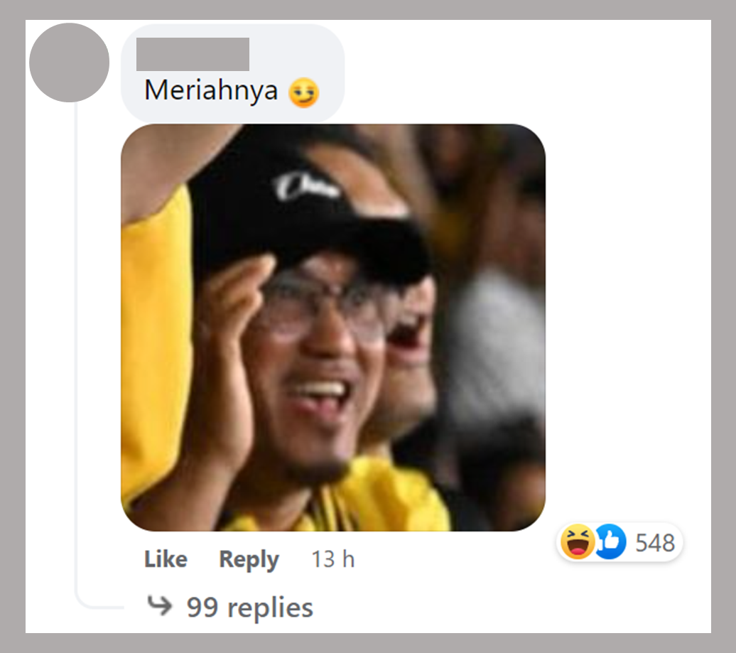 依斯迈沙比里为球员打气的面子书贴文底下,更是成了活生生的“网络灾难现场”。其中,沙比里某则贴文显示出他与阿末法依沙同框的照片。只见沙比里目无表情地高举双手,而左侧的阿末法依沙就七情上脸地鼓掌欢呼,形成强烈反差。