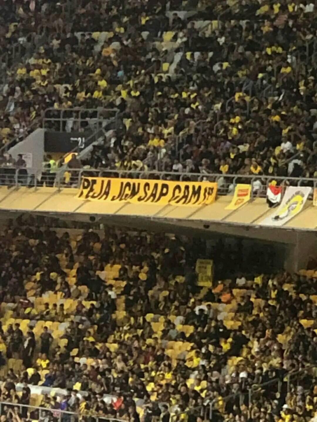 座无虚席的观众席上除了一片黄海,还有挂着了一条黄色的布条,写着“PEJA JGN SAP GAM!!!”