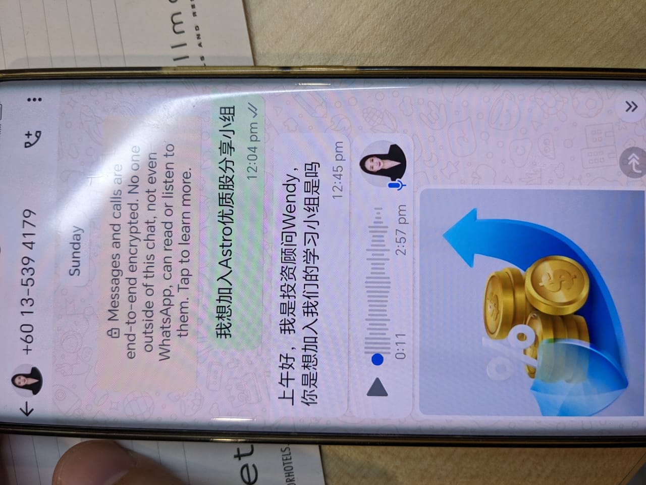根据截图内容,观众在点击链接后,便收到自称是投资顾问的WhatsApp讯息,来“接待”他加入所谓的投资学习小组。