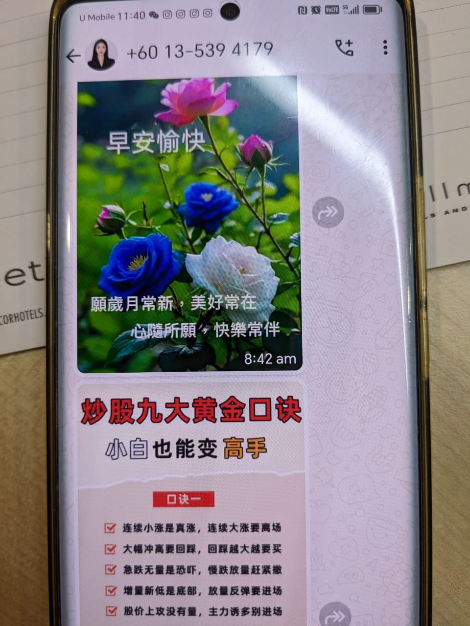 不仅如此,对方也会利用“早安图”或“炒股口诀”图片,不断私讯轰炸受害者。
