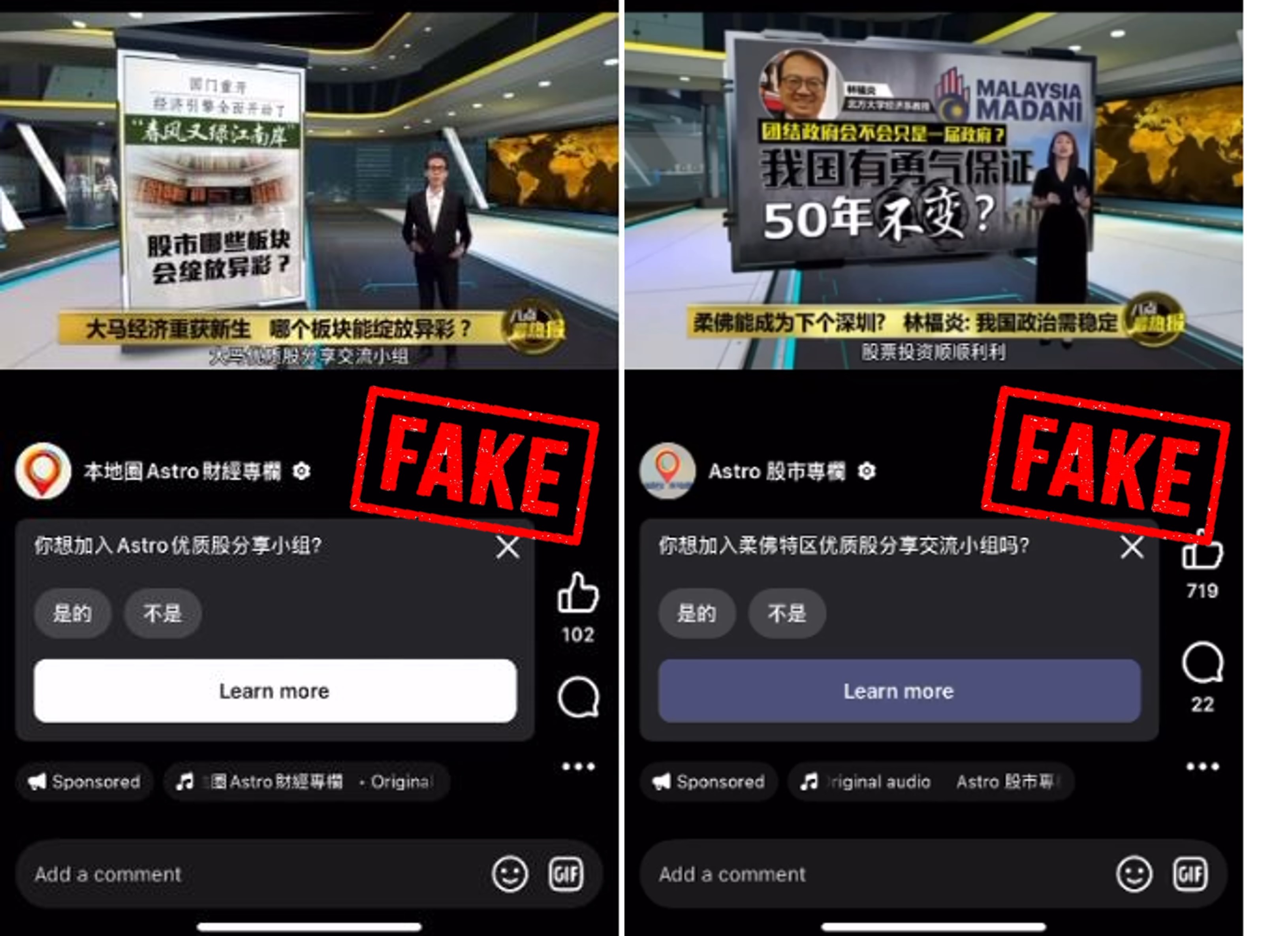股票投资群组骗局层出不穷。尤其近期在面子书涌现不少假的Astro“财经”、“投资”、“炒股”专页。骗子除了冒充Astro名义,更通过AI技术,制作虚假《八点最热报》视频,以此诱骗民众加入投资群组。
