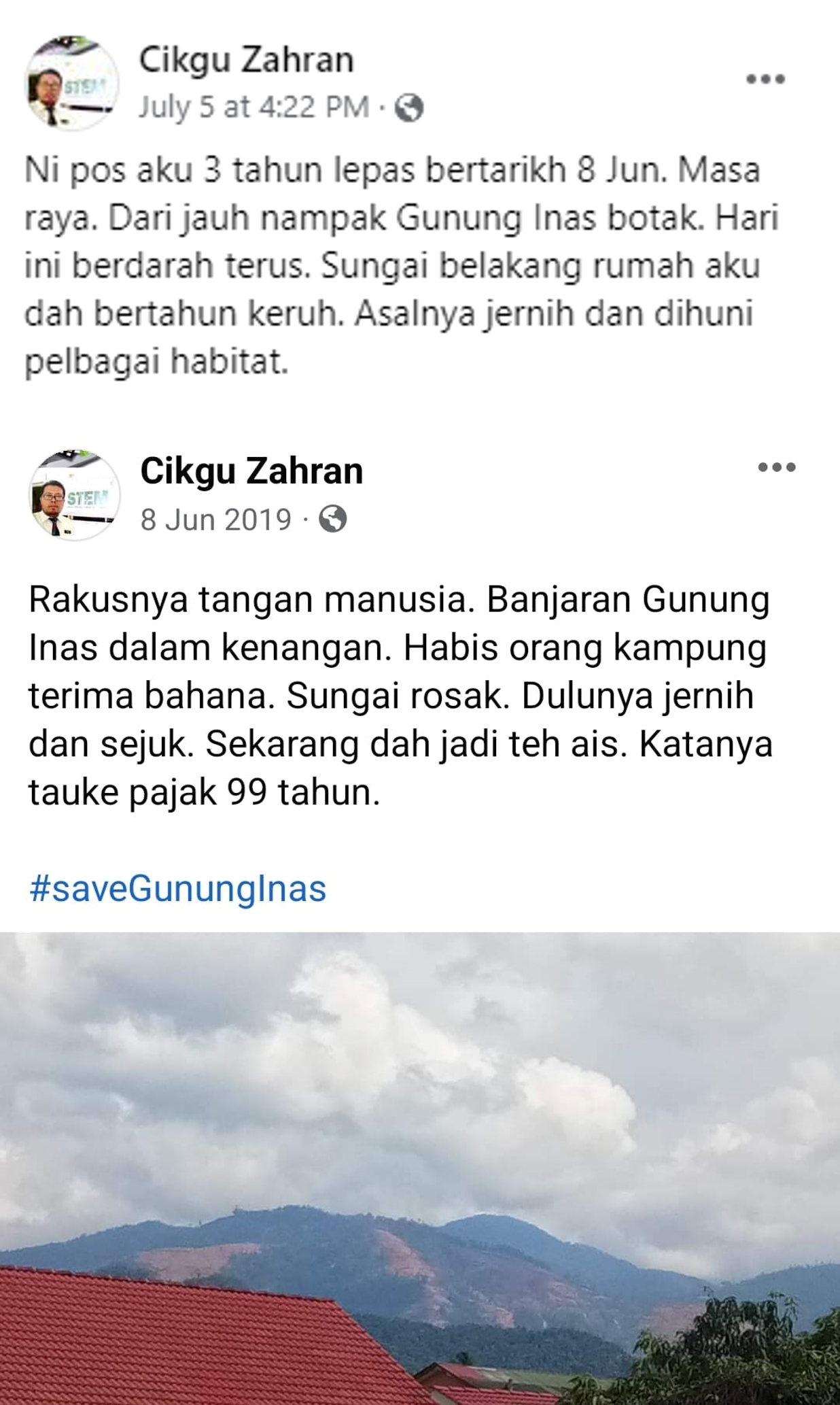 “我乘坐警方的直升机到空中勘察灾区,能够看到源自依纳斯山(Gunung Inas)至灾区和古邦镇(Pekan Kupang)的整个水道。”