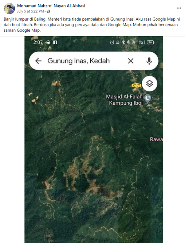 吉打华玲发生闪电洪灾,过度砍伐森林与猫山王榴梿园种植计划被指是肇因,惟吉打州大臣归咎是依纳斯山上有大量积水沿着陡坡急涌而下所致,再度否认是榴梿园酿祸。