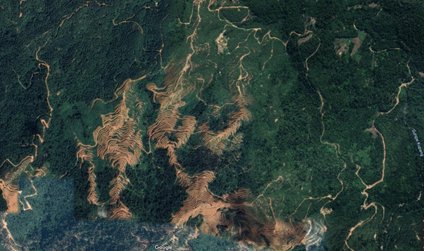 放大后的谷歌地图亦可清楚看到依纳斯山多处森林树木被砍伐,黄褐色的山土清晰可见。