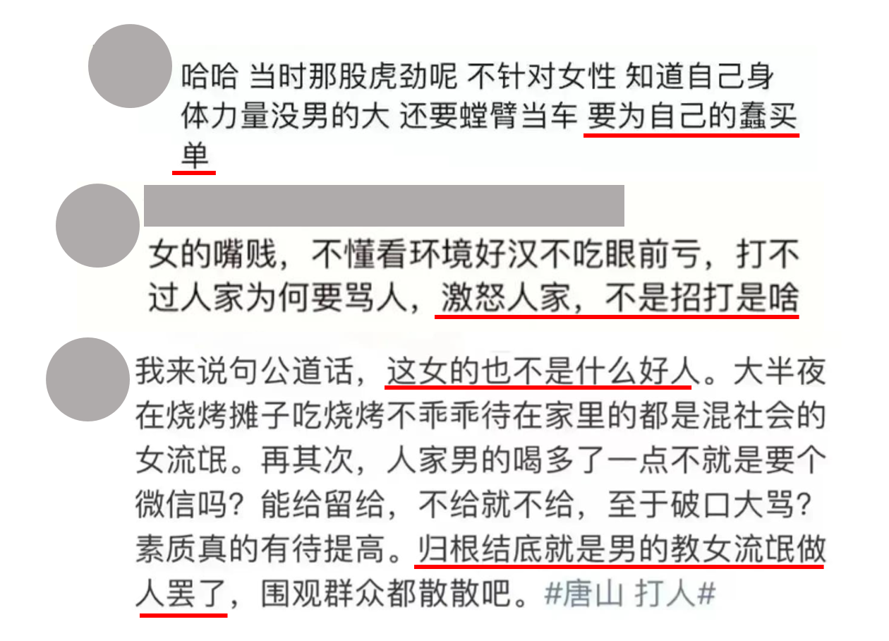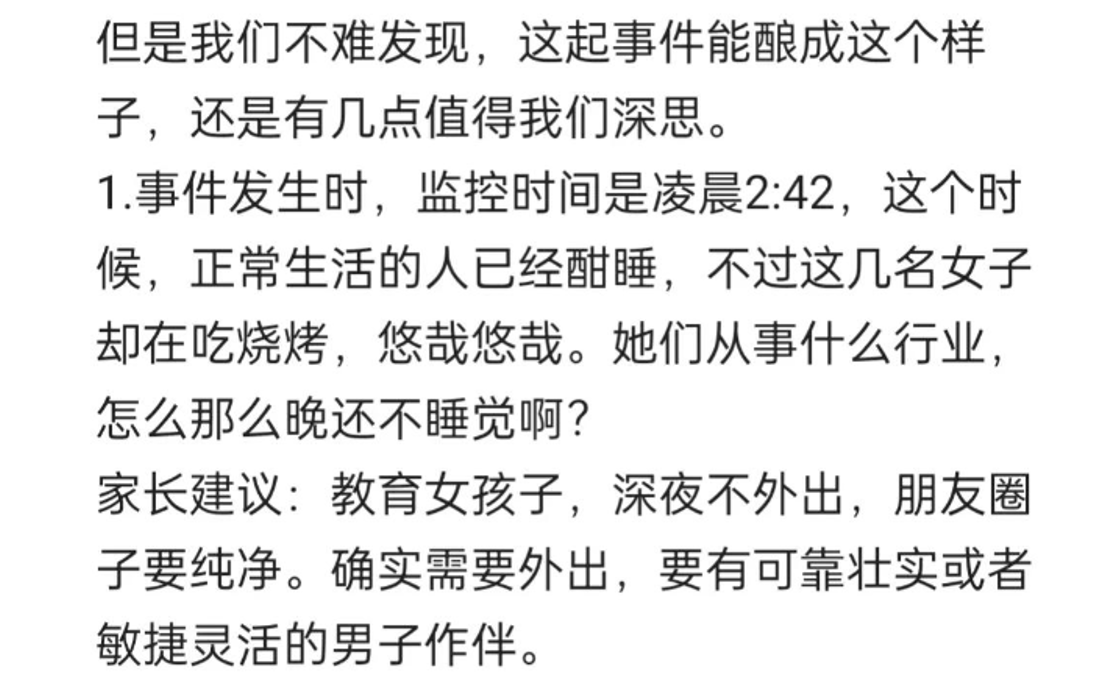 其中,有网民在微博发文指出,女性本就不该在半夜出门用餐,并且质疑受害女子在凌晨2点还在烧烤店里也“绝非正常女人”。