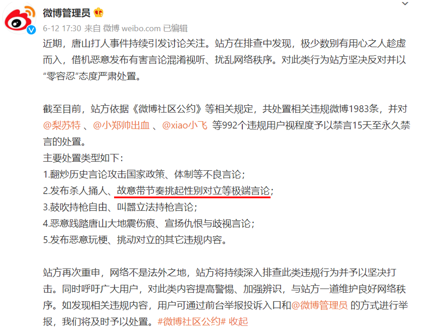同时中国第一大社交媒体平台微博宣布,该平台已禁言265个“挑唆性别对立”的帐号,让本想借着“唐山打人事件”发表内心恐惧的用户感到不安。