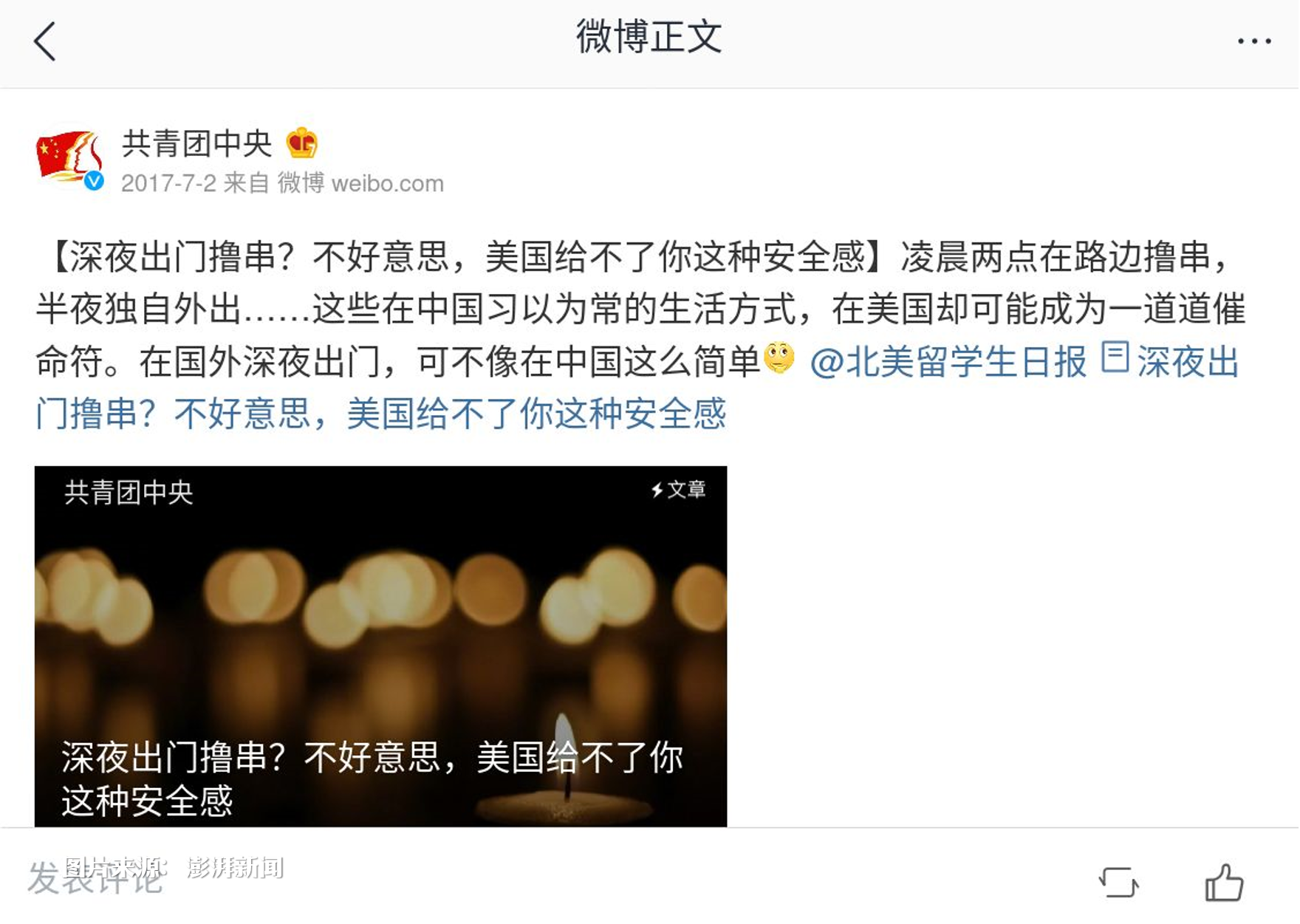 “深夜出门撸串?不好意思,美国无法给你这种安全感,在中国这种习以为常的生活方式,在美国却可能成为催命符。”