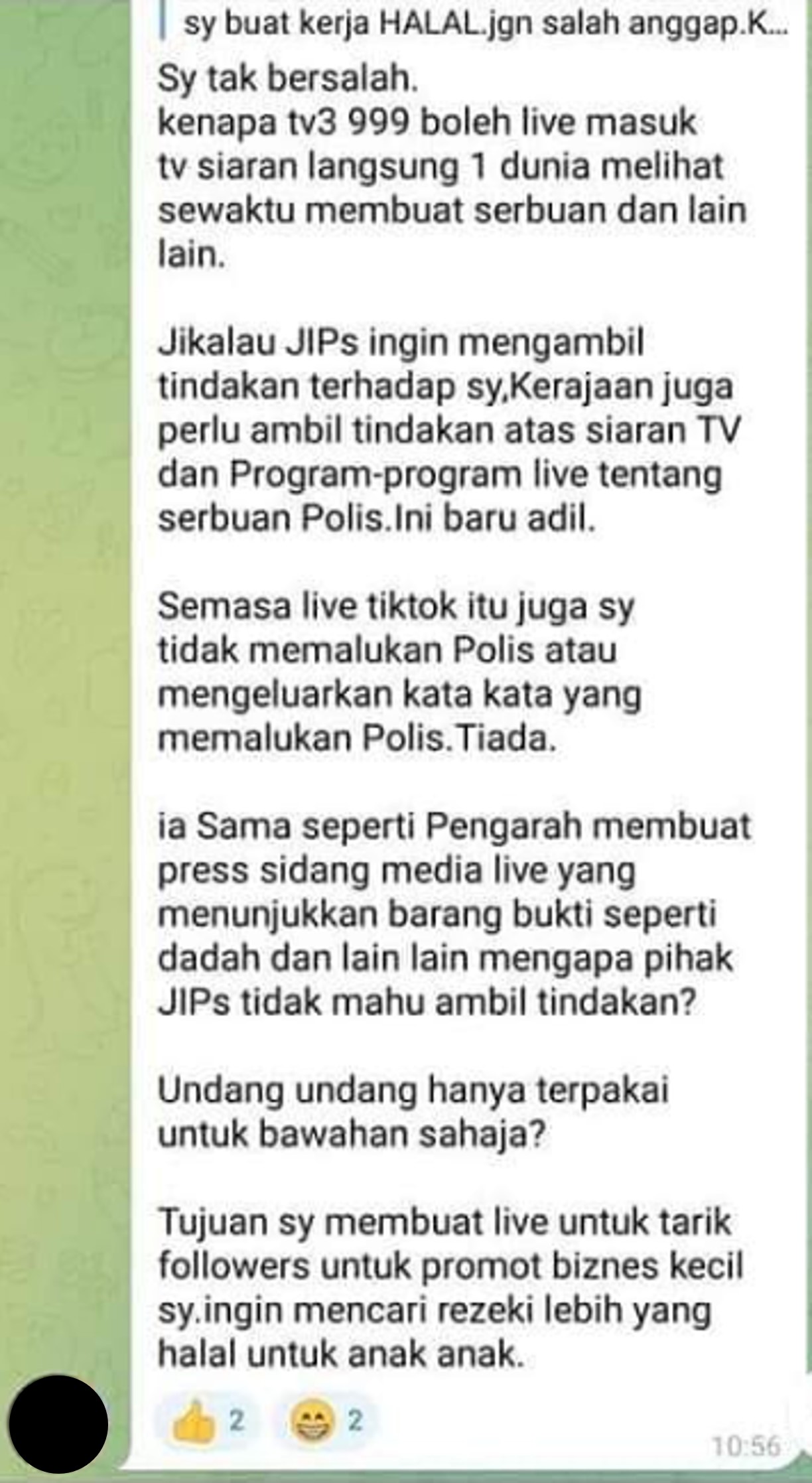 “我在TikTok做直播的时候也没有作出或发表,任何有辱警方的事,没有。这就跟总监开记者会时,媒体可以同步直播并展示毒品等证据,为何警方又不采取行动呢?难道所谓的法律仅限约束下属吗?”