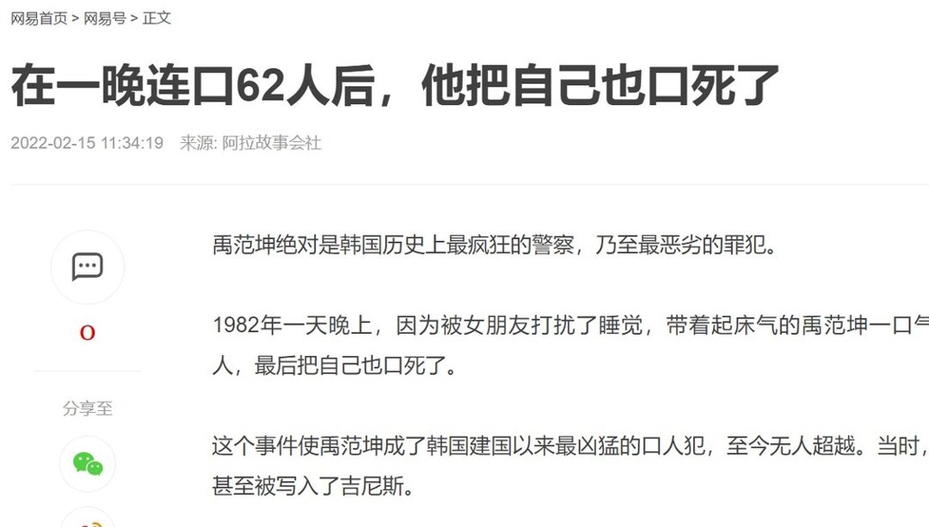 这是中国新闻平台《网易新闻》底下的自媒体“阿拉故事会社”早前发布的一篇文章,是在介绍韩国杀人犯禹范坤的故事,然而仔细一看,内文中的所有“杀”字,全部都变成“口”。