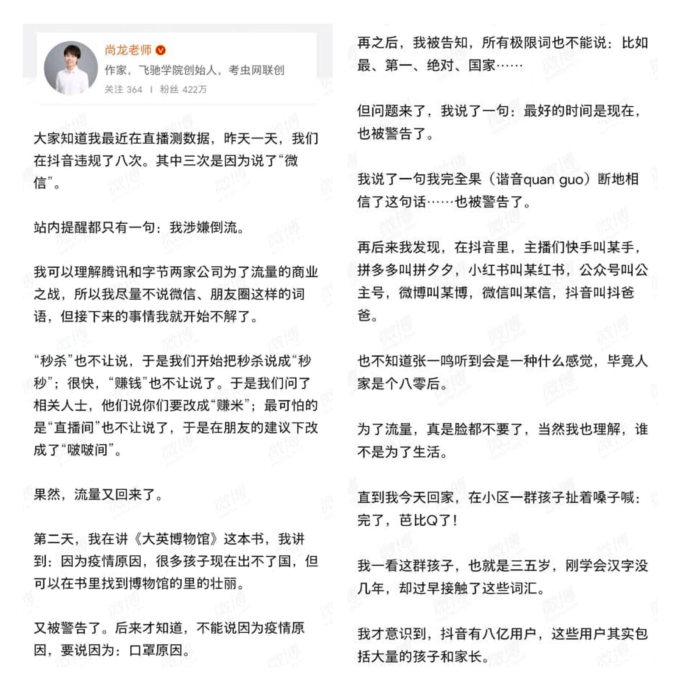 微博粉丝多达422万的作家李尚龙发文吐槽抖音的屏蔽词,不满一天直播违禁八次,其中三次是因为提到了微信。