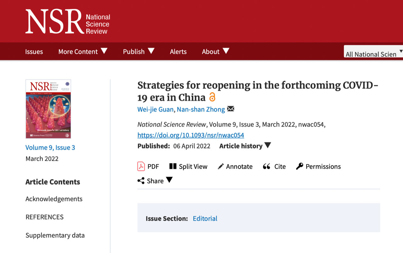 值得一提的是,中国防疫专家钟南山曾在4月6日,以英文在“国家科学评论”(National Science Review)发表论文《关于中国在即将到来的新冠肺炎时代重新开放的战略》,主张中国不能长期追求“动态清零”。