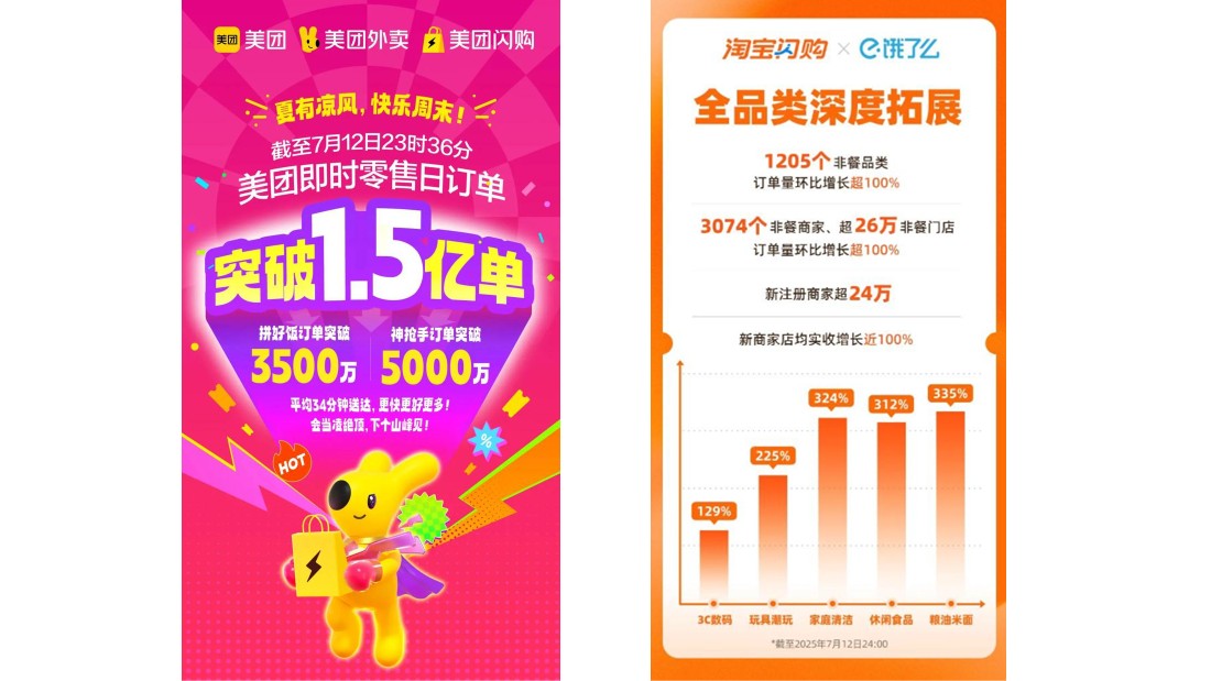 伴随补贴升级,各平台的订饭数量也迎来大幅增长,美团在7月12日宣布即时零售日订单量突破1.5亿单。