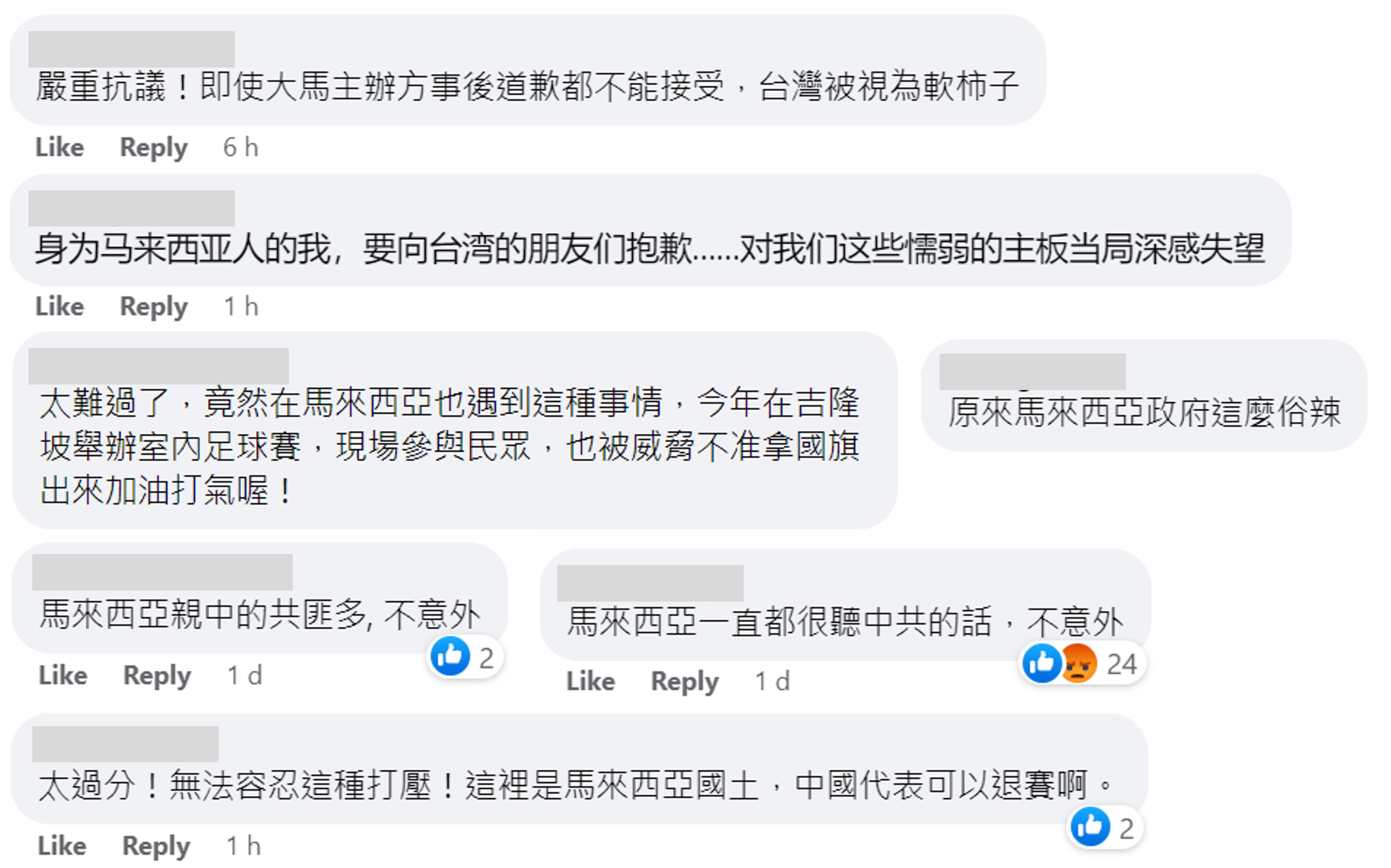 其中一名大马人向台湾人道歉,并称:“对我们这些懦弱的主办当局深感失望。”