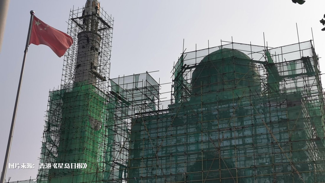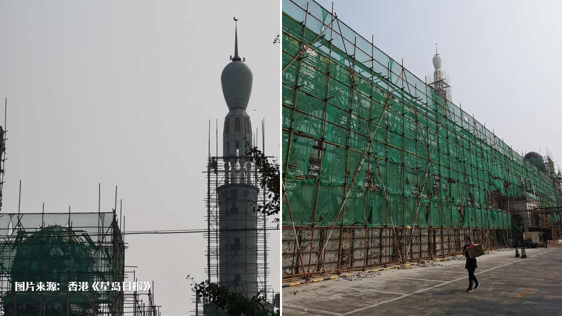 报道称,整座清真寺如今已被鹰架和建筑安全防护网包围,门口悬挂着五星红旗,有几个大圆顶的塔尖装饰物已经不见,只剩下3个塔尖的新月标志装饰物还在。