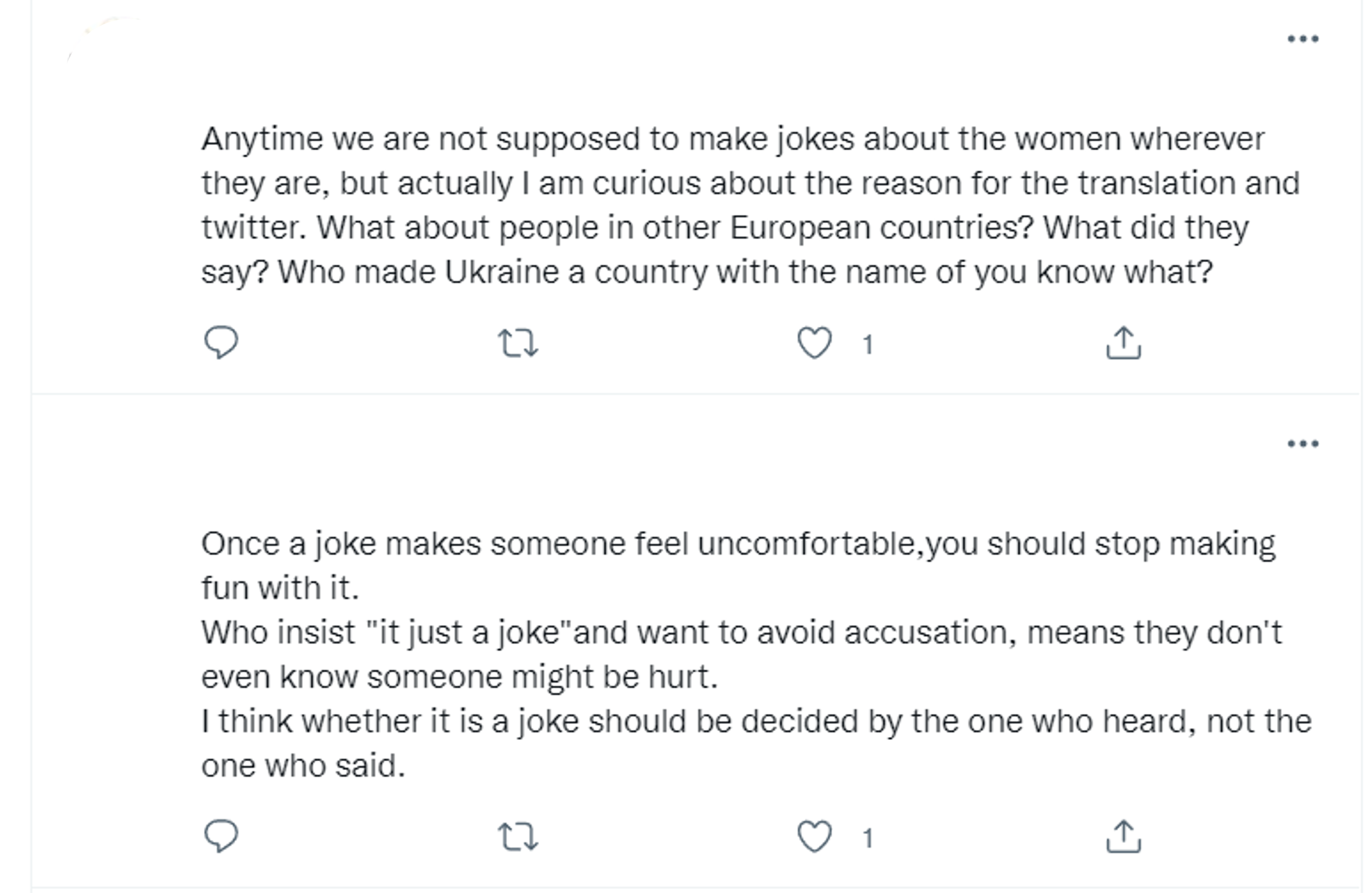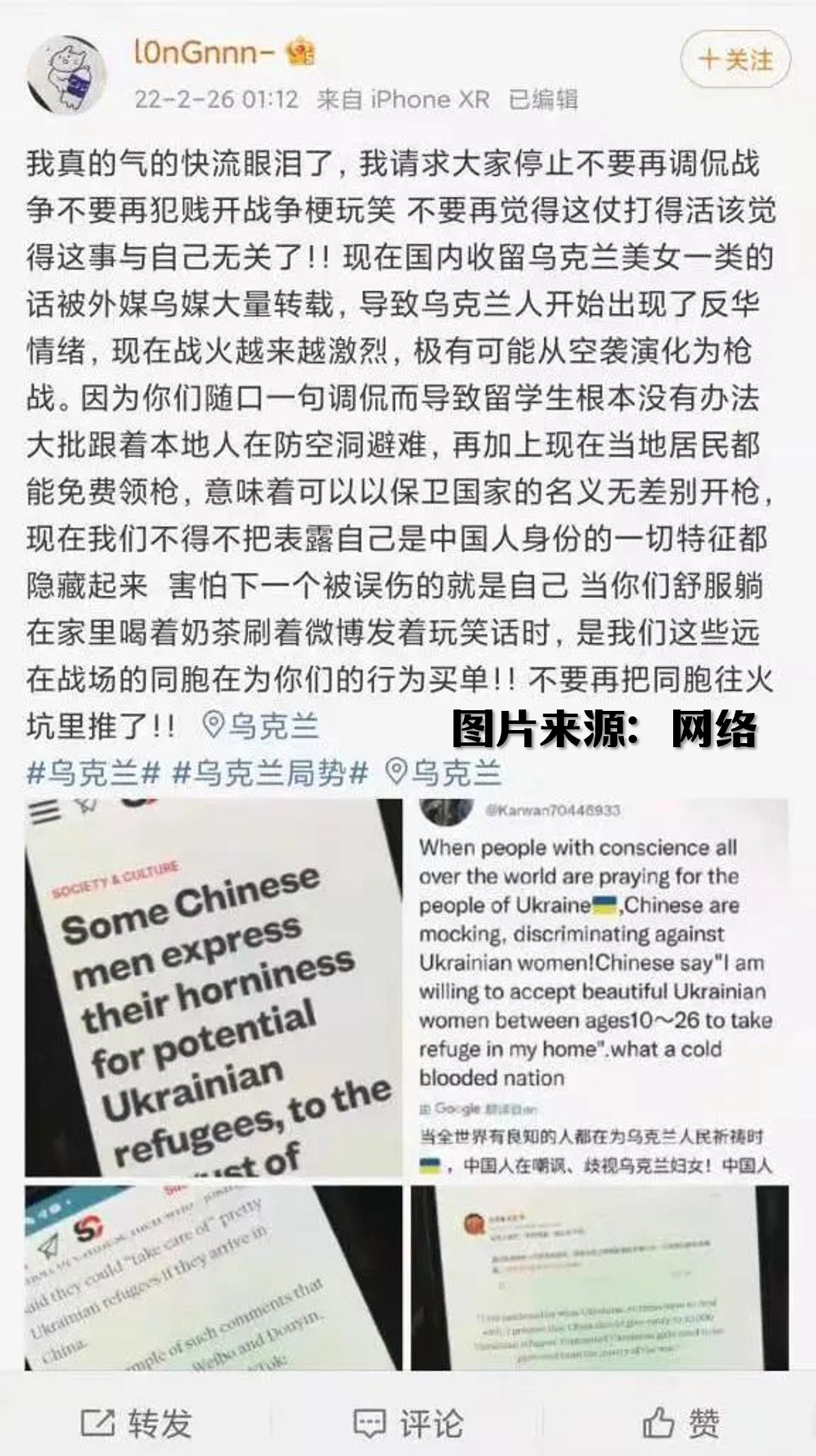 与此同时,针对中国网络出现物化乌克兰女性的言论,一名账号为“l0nGnnn”网民今日在微博发文,呼吁中国同胞停止调侃战争。
