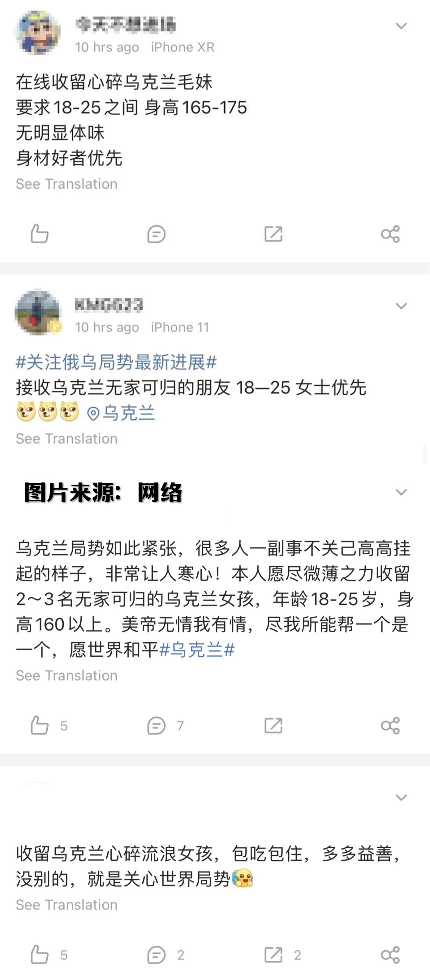 乌克兰境内的中国人草木皆兵,但在世界的另一端,中国内不少网友竟然在网络上发布,指自己愿意收留乌克兰单身女孩,提供她们包吃包住等等的夸张下流言论。