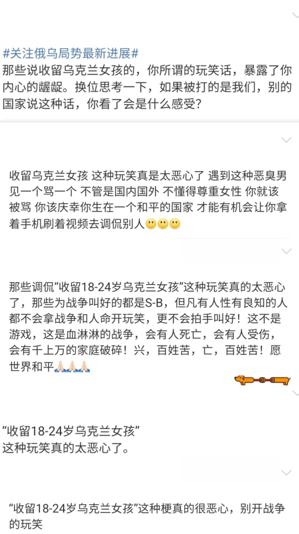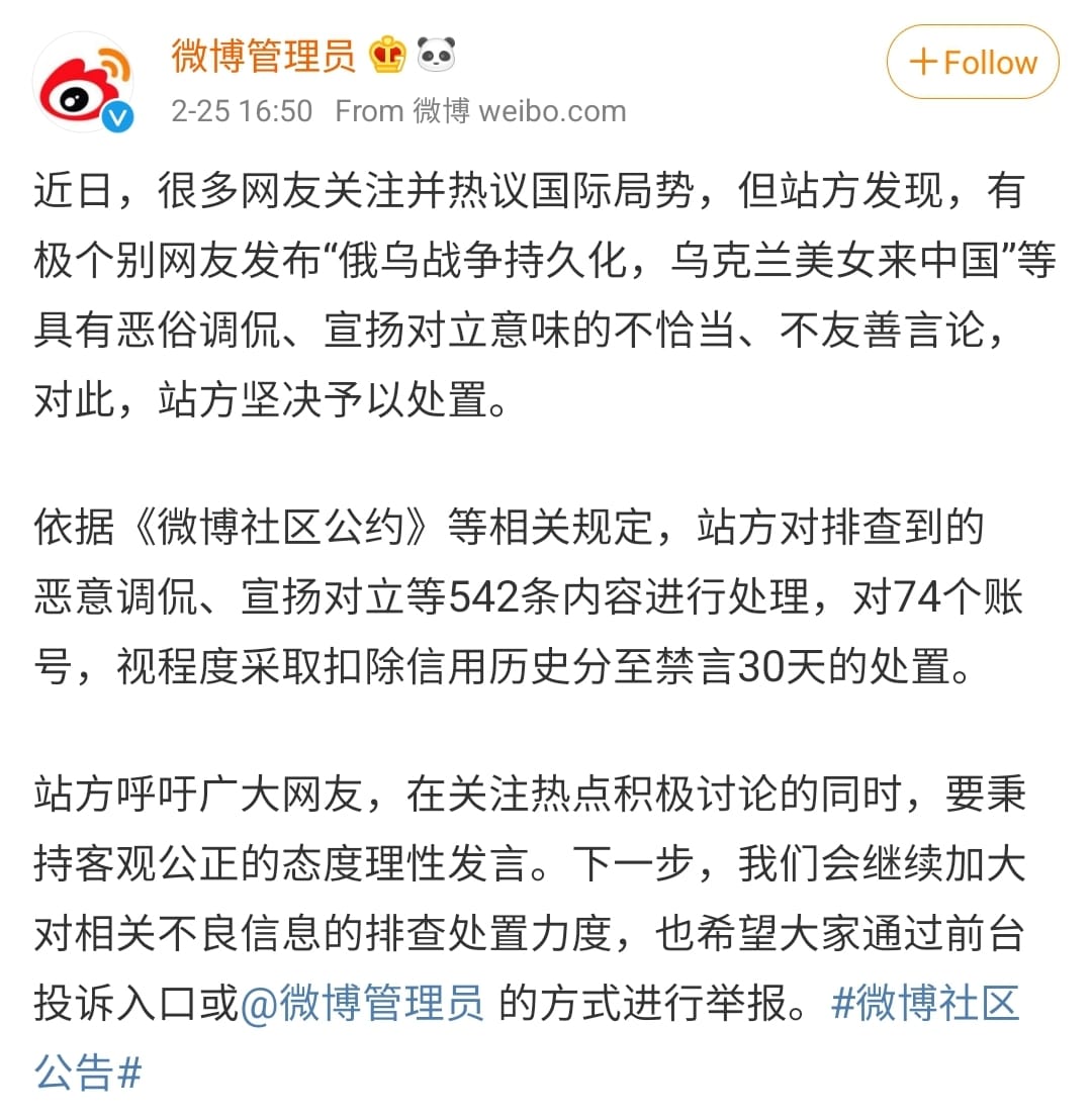 中国网友的低级言论陆续遭到其他网友检举,而微博官方账户昨日(2月25日)发文强调,已针对网友发布“俄乌战争持久化,乌克兰美女来中国”等不善言论给予处置。同时也对74个违规账号采取禁言30天的处置。