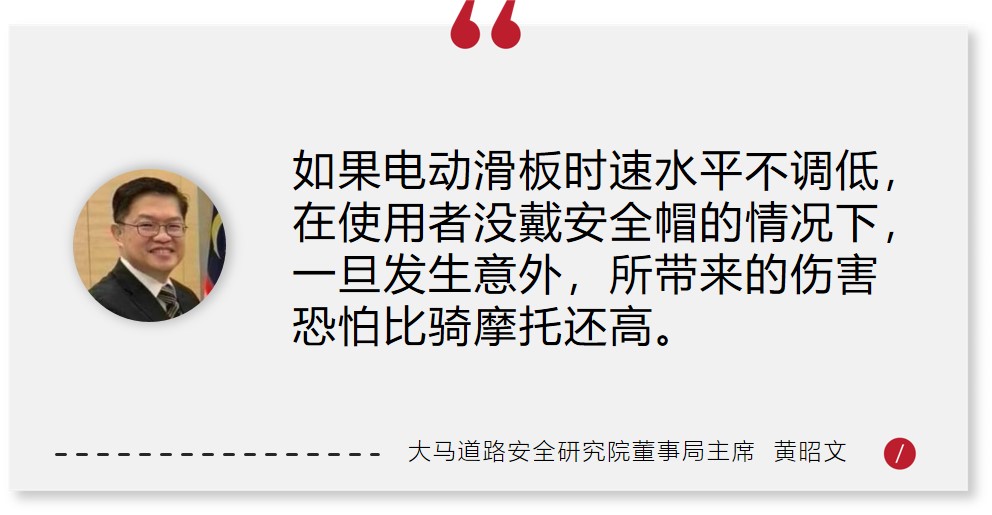 “我们必须要了解到电动滑板车的危险性,当它的时速提高到一定的水平,安全考量必须处理好,避免成为另一个像是蚊型脚车的社会问题。”
