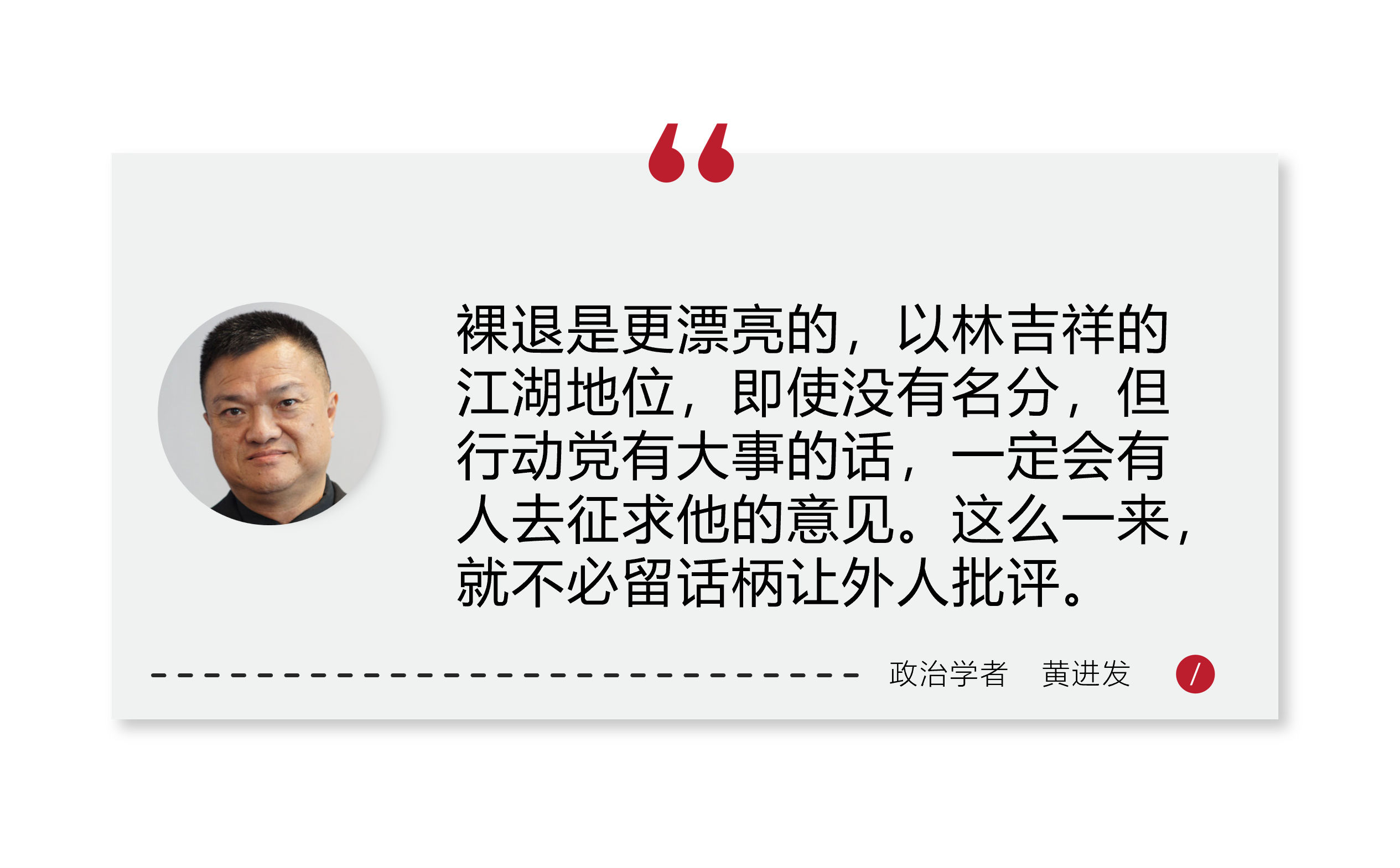 针对外界将“退而不休”的林吉祥,与新加坡开国总理李光耀对比,指林吉祥担任“资政”一事,是在垂帘听政的说法,行动党全国副主席倪可敏强烈驳斥,指林吉祥从未要求过任何党职,委任他成为党资政,事实上是火箭对林吉祥的一种尊重和肯定。