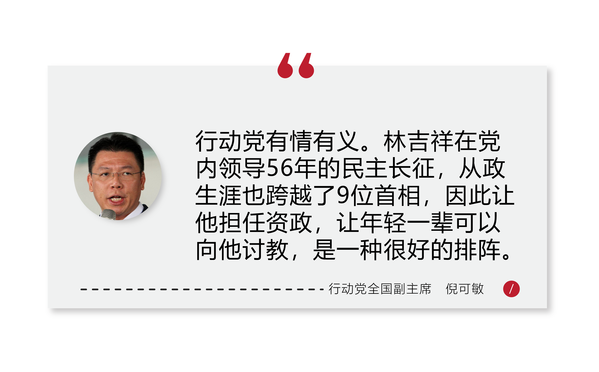 行动党元老林吉祥昨天宣布退出党选,来届大选也不会上阵,但行动党在昨晚改选产生新领导层后,破天荒打破先例,首次设立“资政”职位让林吉祥出任,开创本地政党的先例。
