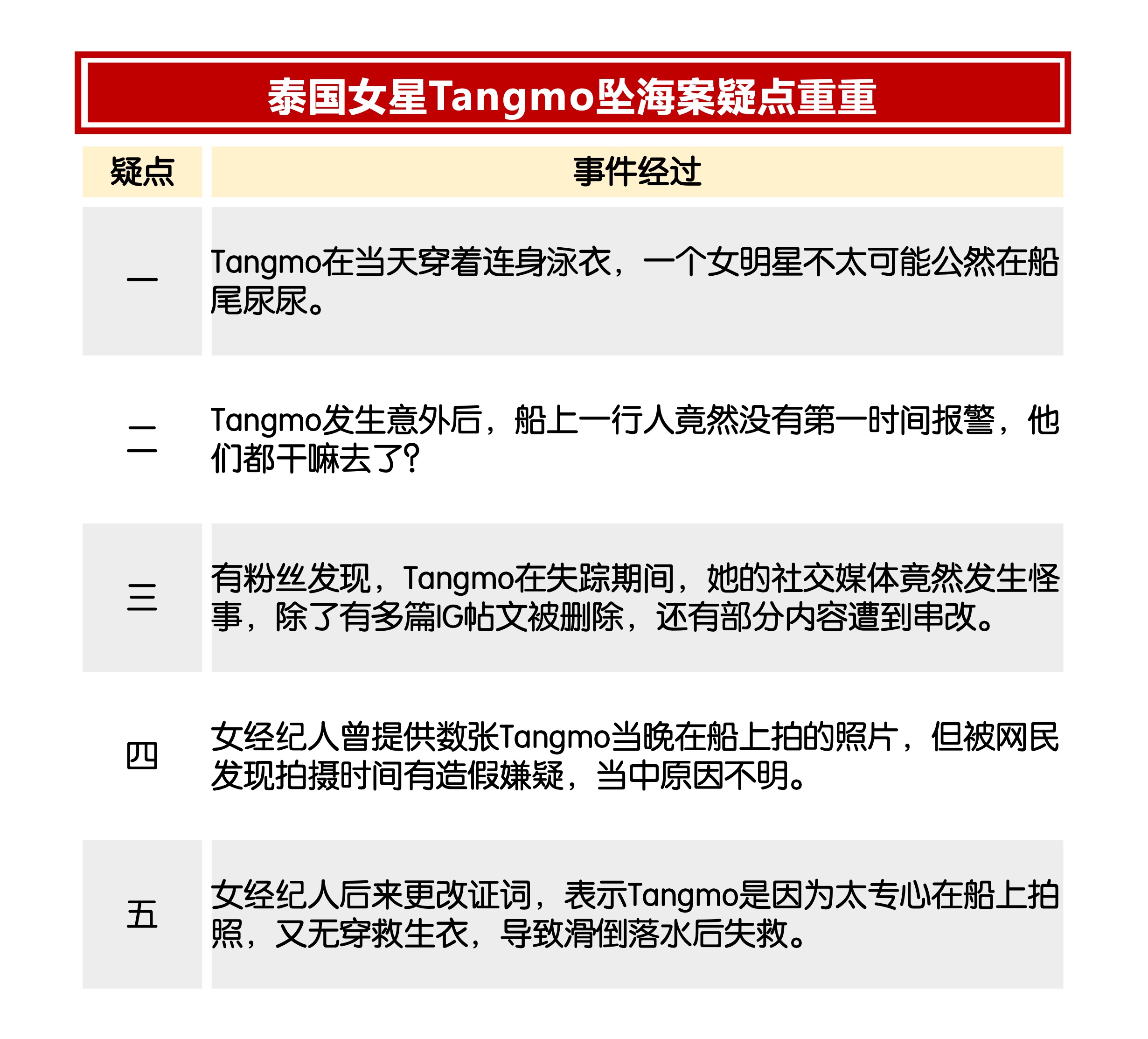 而船上的人口供一致,都说Tangmo去船尾小解意外掉入河中,但她的家属和网民都认为,其中存在不少疑点。
