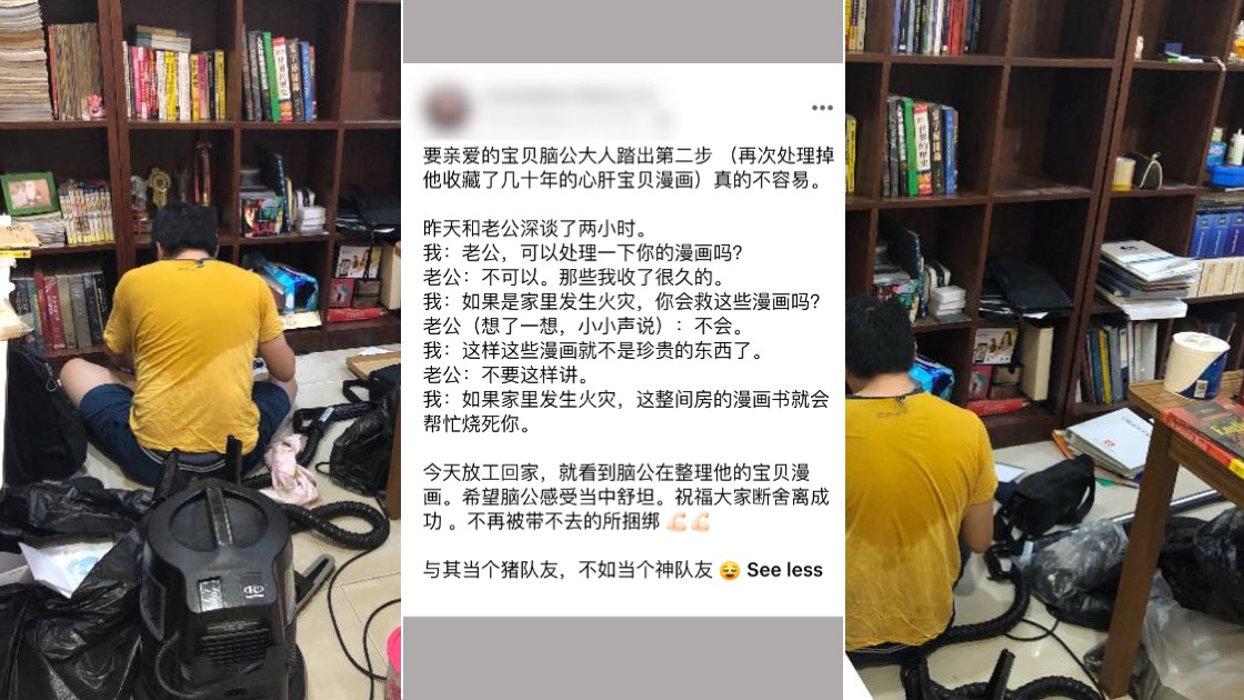 一名女网友在面子书的“断·舍·离”群组发文分享,为了让其丈夫处理掉他收藏几十年的漫画,她与丈夫深谈2小时,最终成功说服了丈夫。
