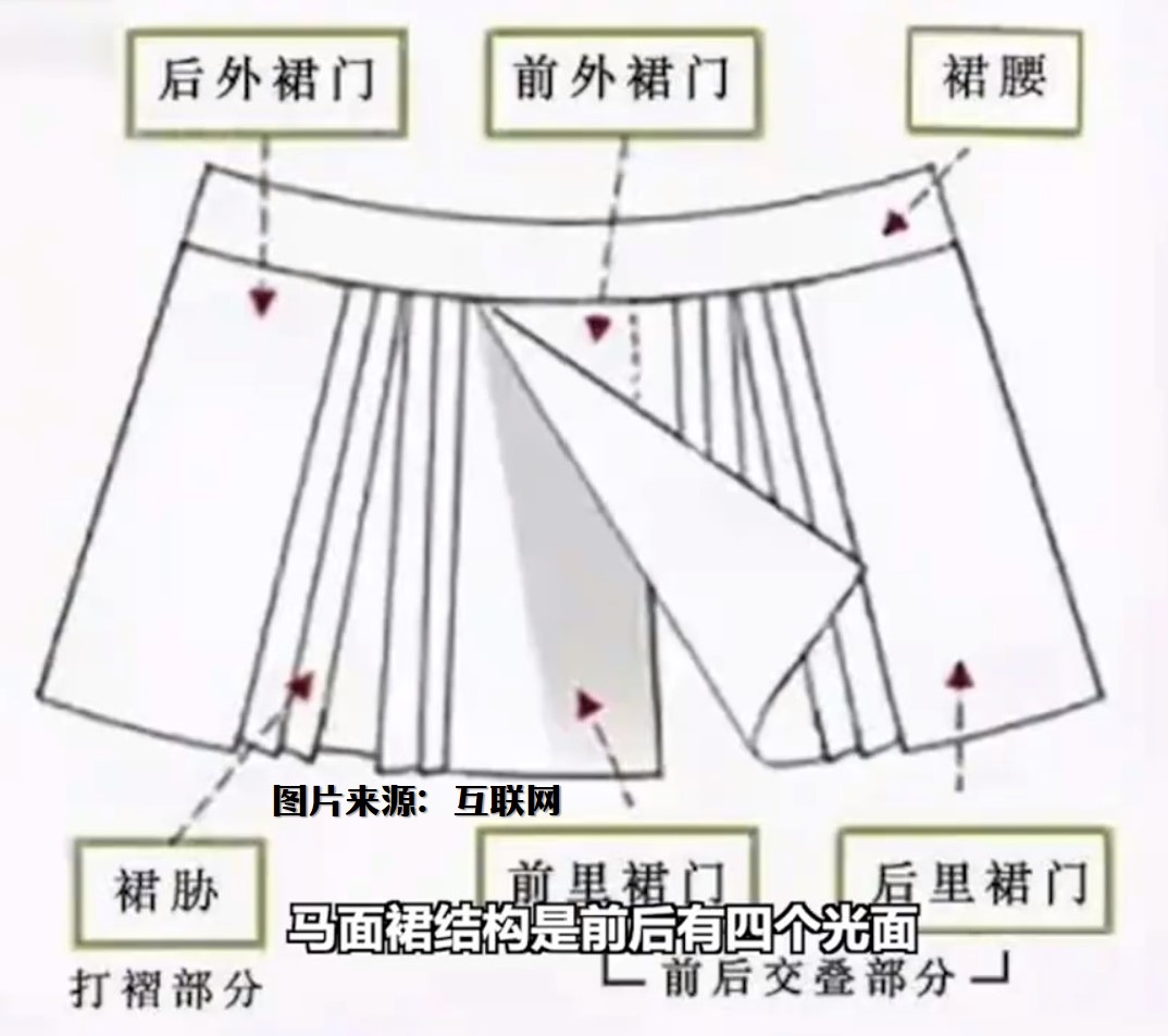 马面裙的设计一般为两片式,前后共有四个裙门,两两重合,左右打褶,因中间裙门重合而成的光面被称为“马面”,而得名马面裙。通常外裙门设有装饰,至于裙腰则使用白色布,以绳或纽固结,故有白头偕老之意。