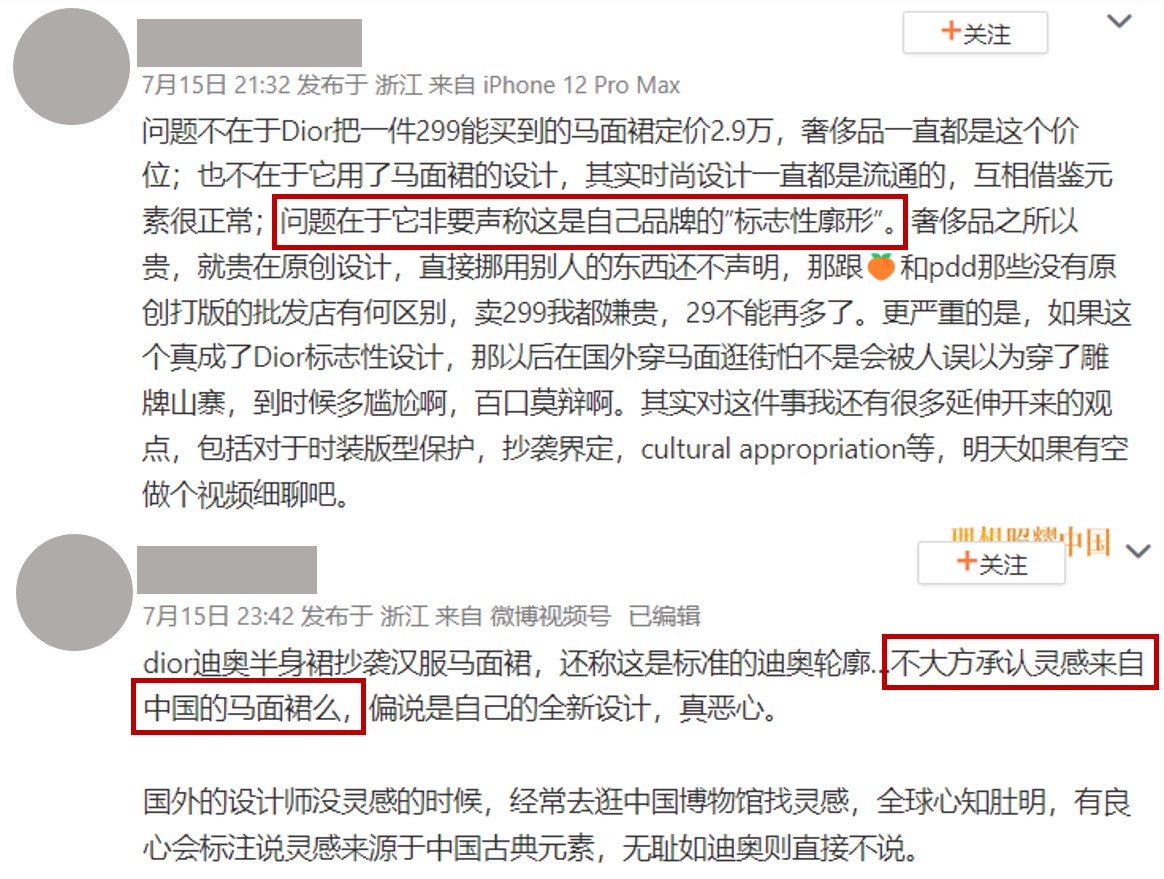 惟也有少数的中国网民认为,指控迪奥抄袭马面裙实在太过上纲上线。该网民质疑,如果按迪奥抄袭马面裙的说法,是不是也意味着所有的西装设计也都是在抄袭?