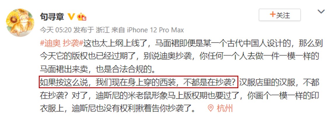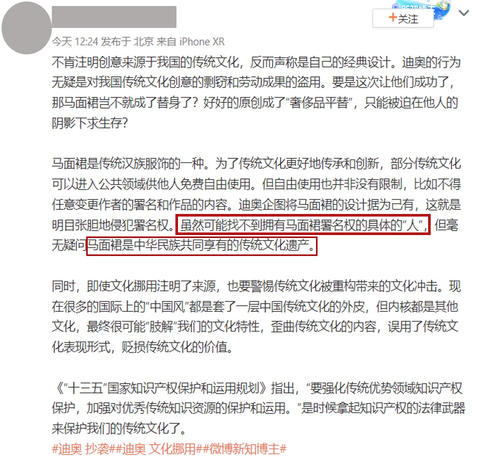 不过,有网民指出,这起事件不算抄袭,因为马面裙并没有知识产权,也不是非物质文化遗产,反倒是性质更严重的文化挪用。