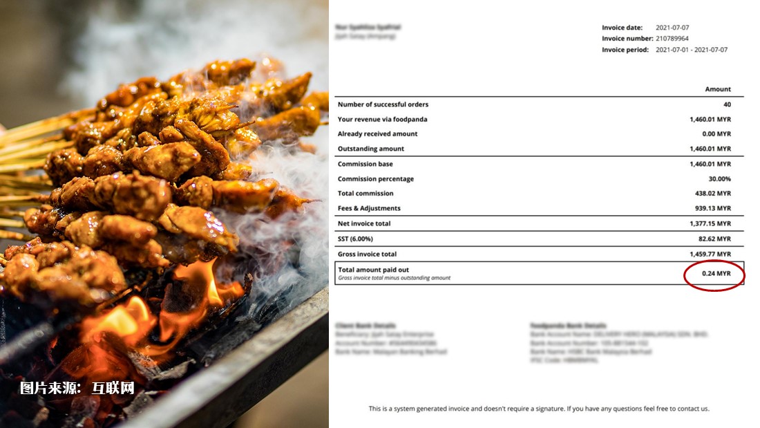 最近,一名沙爹业者在社交媒体上,分享送餐平台的单据,引起各界关注。单据列明,该名业者在平台上完成40单交易,共RM1,460.01的销量,扣除30%、近RM440的佣金,RM900的费用,以及RM80的销售税后,最后他只赚了RM0.24,等于白忙一场。