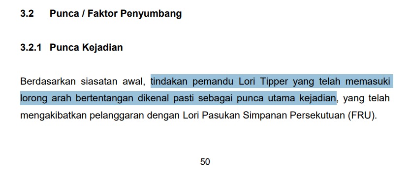 截图自Laporan Awal Pasukan Petugan Khas Kemalangan Teluk Intan pada 13 Mei 2025“调查仍在进行中,以进一步查明该名沙石罗里司机驶入对向车道的具体原因。”