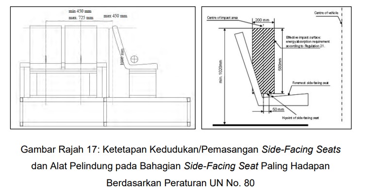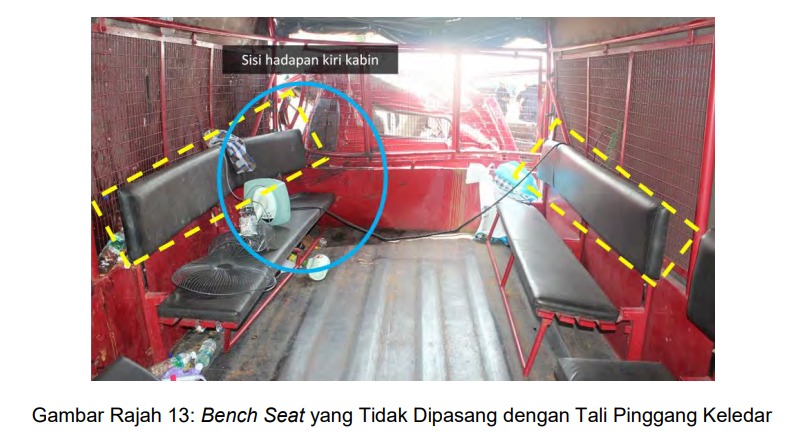 《联合国法规》No.80规定,某类型的车辆可设置侧向座位,但必须遵守严格的安全标准,包括通过安全带或保护装置来保护乘客、座位最低高度为1米,以及座位之间的距离应在450至725毫米之间。(截图自Laporan Awal Pasukan Petugan Khas Kemalangan Teluk Intan pada 13 Mei 2025)