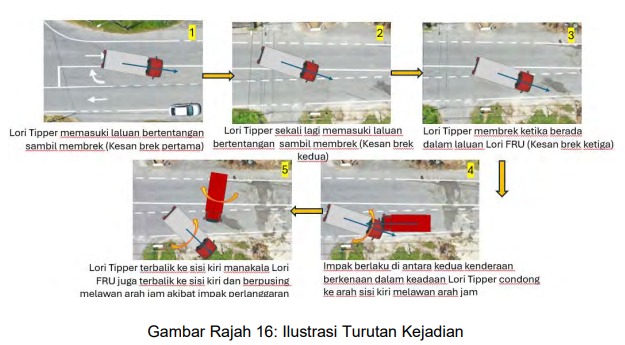 图16说明事发顺序,从沙石罗里第一次刹车痕迹开始,至两辆罗里迎面相撞的最终位置(FRP)。(截图自Laporan Awal Pasukan Petugan Khas Kemalangan Teluk Intan pada 13 Mei 2025)