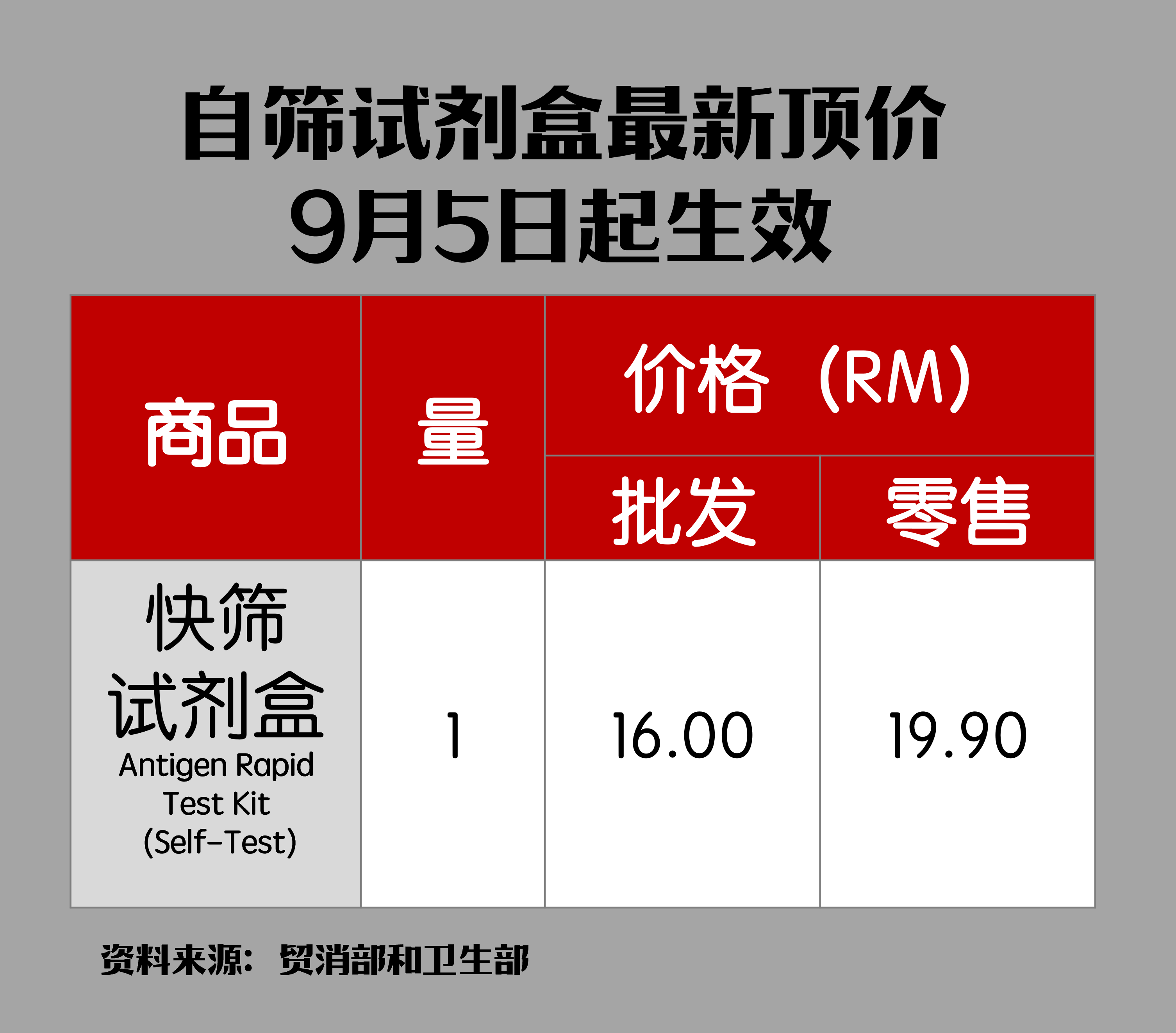 截至9月,居家快筛试剂盒零售价设定为RM19.90,而批发顶价则是RM16.90。