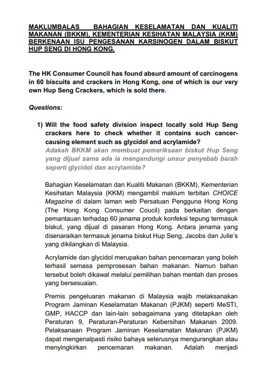 “国民饼干”——合成乒乓较较饼等马来西亚人熟悉的饼干,卷入了“食安风暴”。对此,卫生部急发文告表示,这些食品都经过“食物安全保证计划”(PJKM)。对于香港消费委员会的指控,该部透露会再进一步调查。