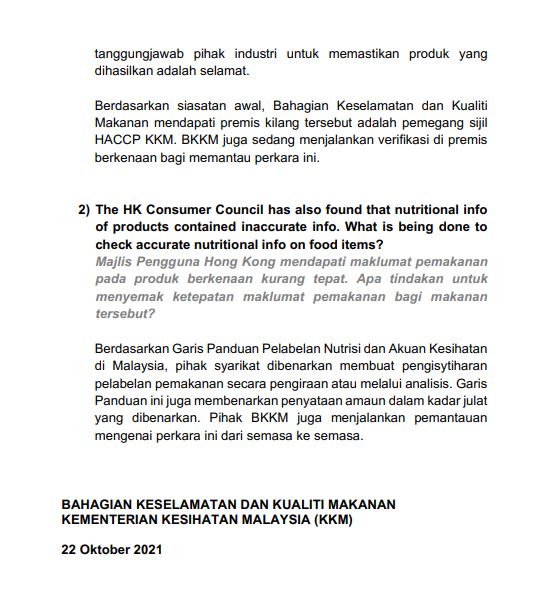 卫部旗下的食品安全及品质部门(BKKM )指,本地生产的合成乒乓较较饼,取得“食物安全保证计划”(PJKM)底下HACCP检测的认证。