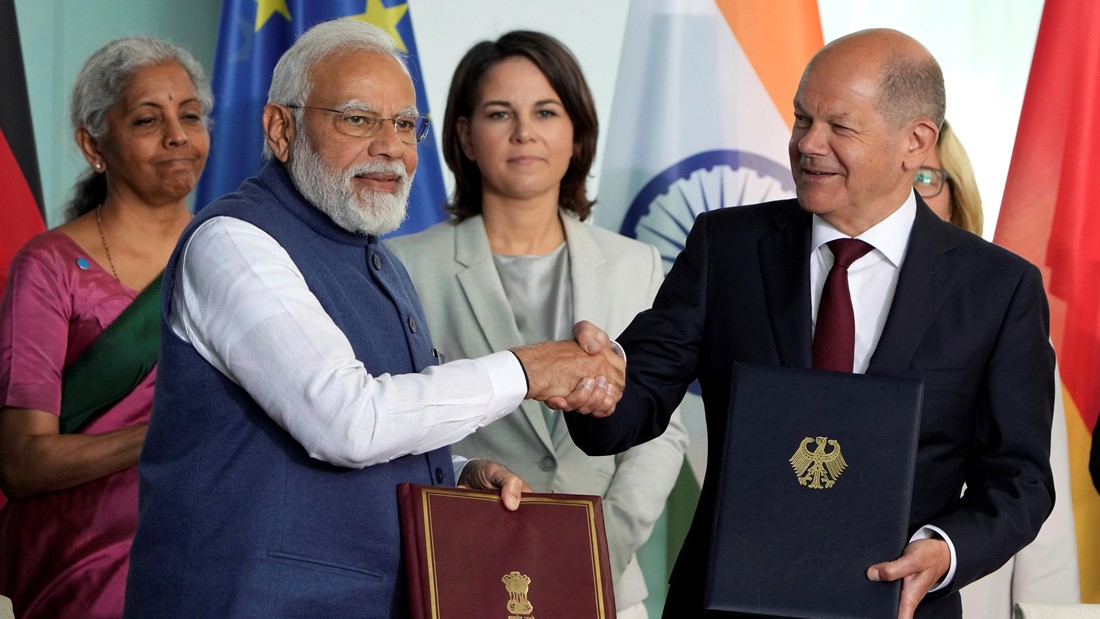 莫迪(左)与朔尔茨(右)在签署共同协议后握手合照。