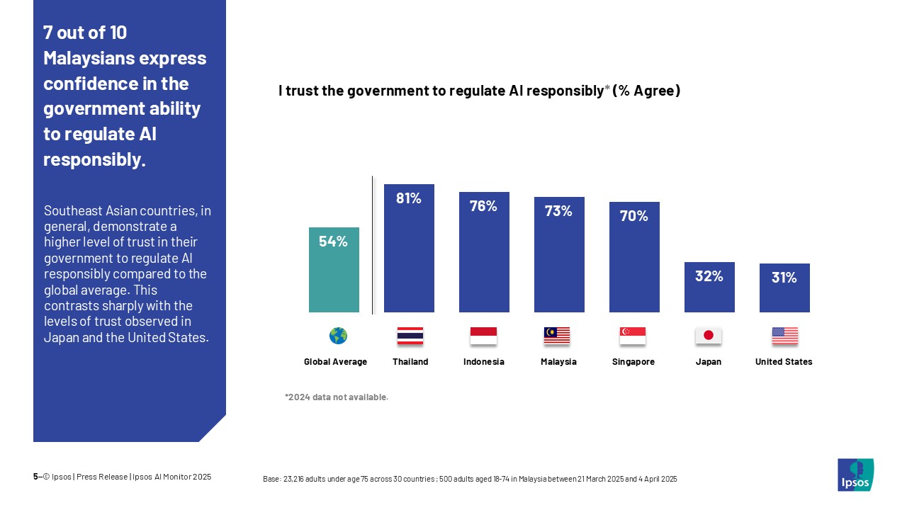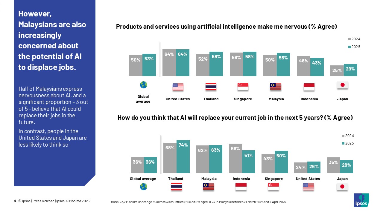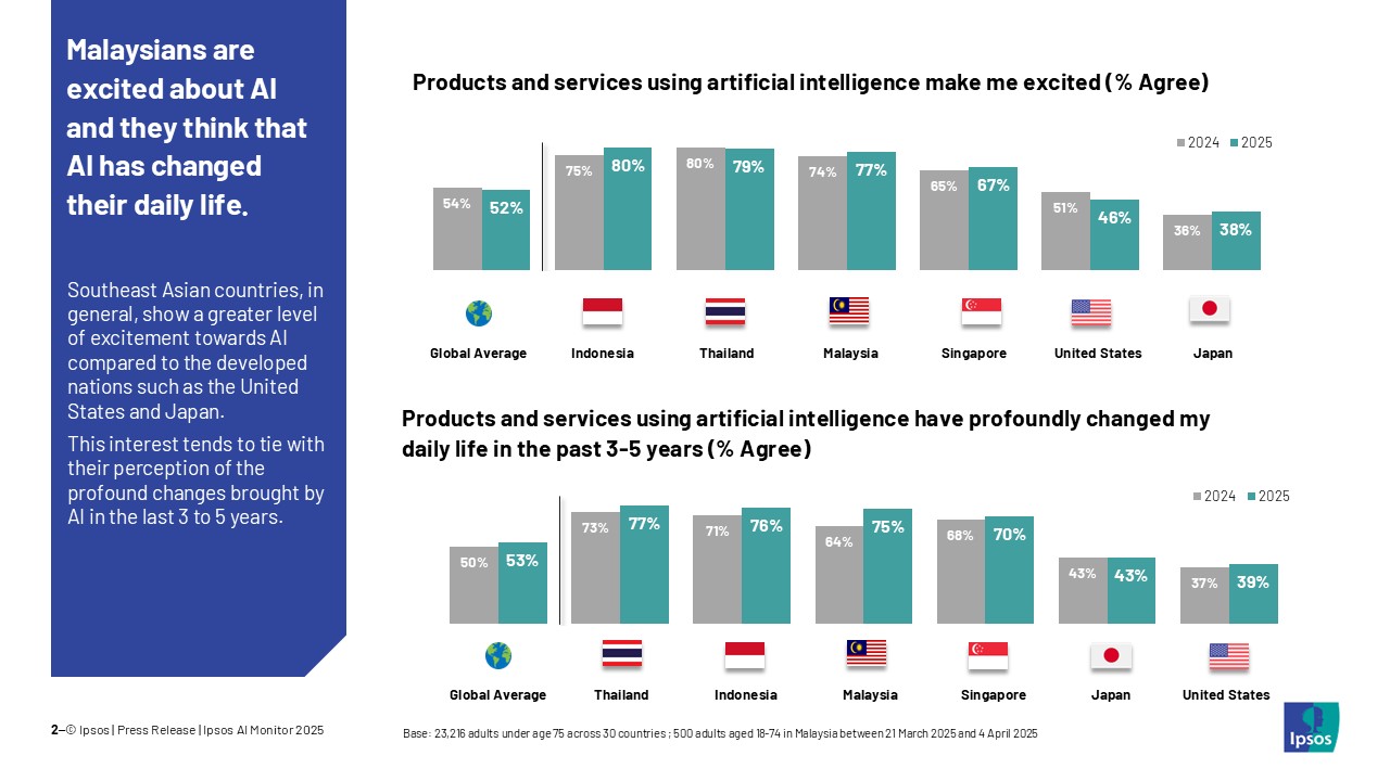 根据益普索(Ipsos)民调公司最新发布的《2025年人工智能观察报告》,超过一半的东南亚国家人民像是泰国、印尼、新加坡和大马,在使用 AI人工智能产品和服务时,感到兴奋。