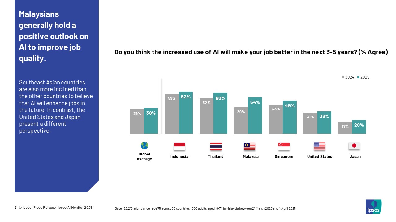 另外,有54%大马受访者也相信AI人工智能,将在未来3至5年内改善他们的工作质量。比起2024年的数据(39%),大幅度增长了15%。