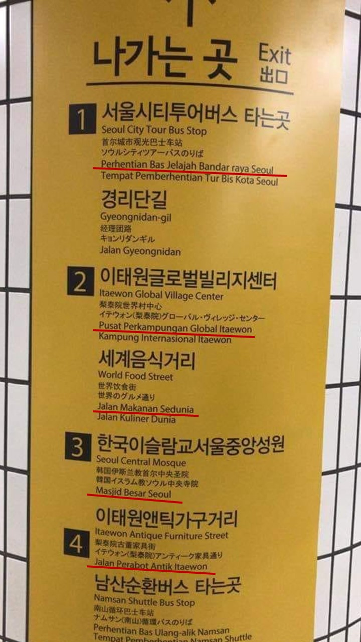 根据马来报《Kosmo》报导,名为Zakaria Azizi的网民透过面子书发文道,尽管路牌信息内的马来文有些不正确的用法,但他表示很高兴,韩国政府愿意作出努力,让来自东南业地区游客也能了解搭乘公共设施的信息。