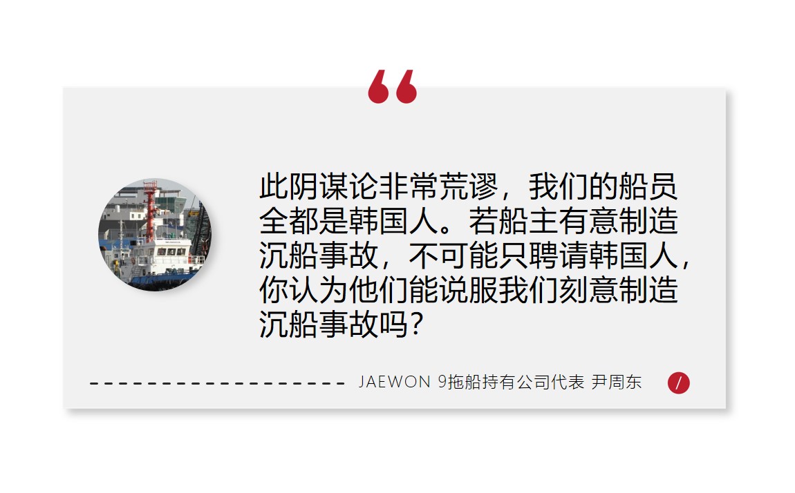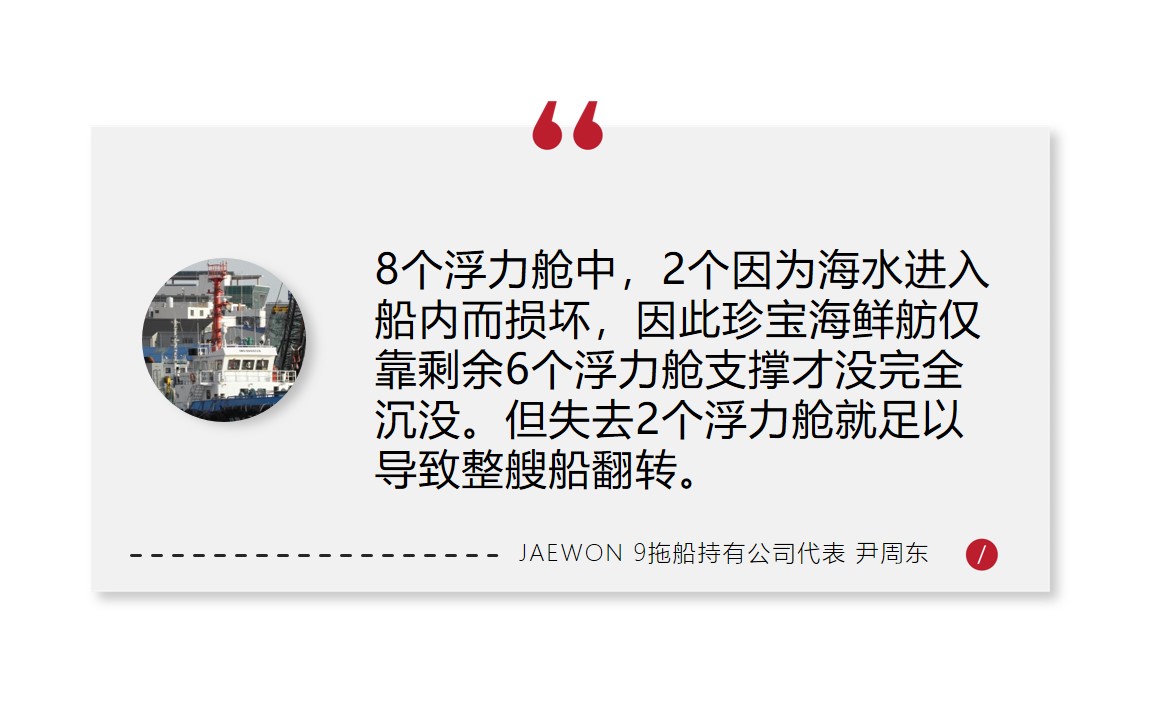 即便如此,国际拖船公司董事尹周东强调,在珍宝海鲜舫出发之前,保险公司已对珍宝海鲜舫和拖船进行调查,确认没有异常后才放行。