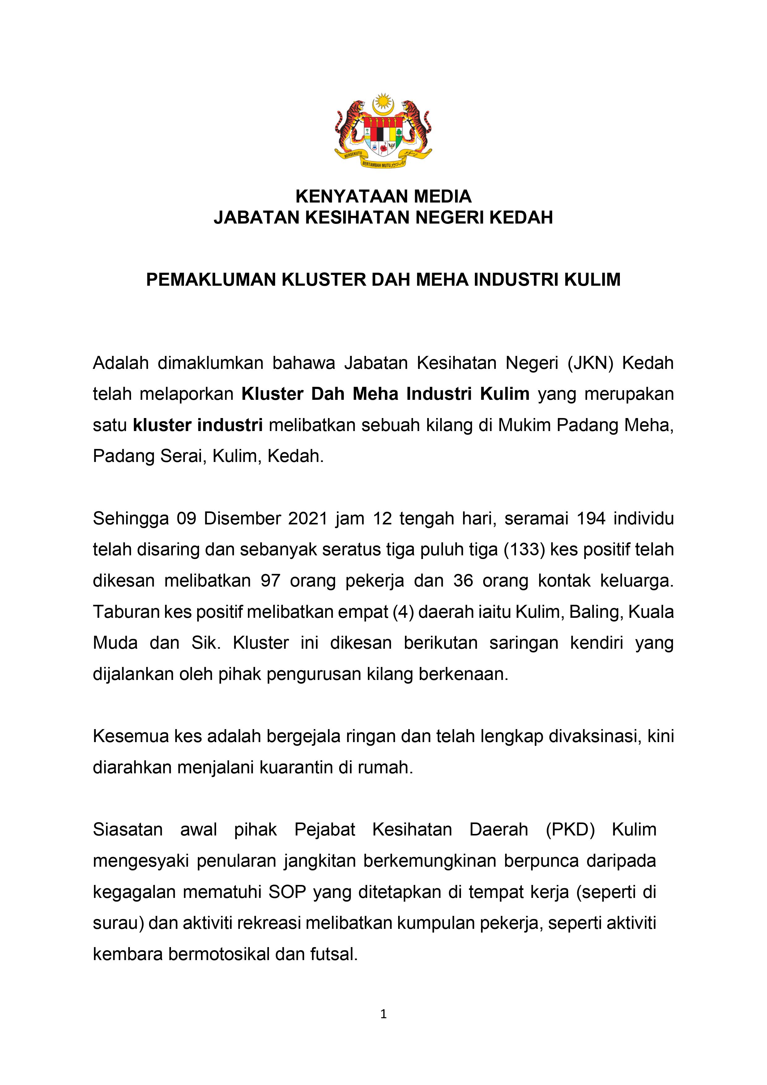 吉打卫生局证实,州内新增的“居林美哈工业区感染群”(Kluster Dah Meha Industri Kulim),目前累计133人确诊。