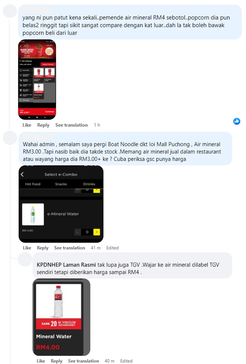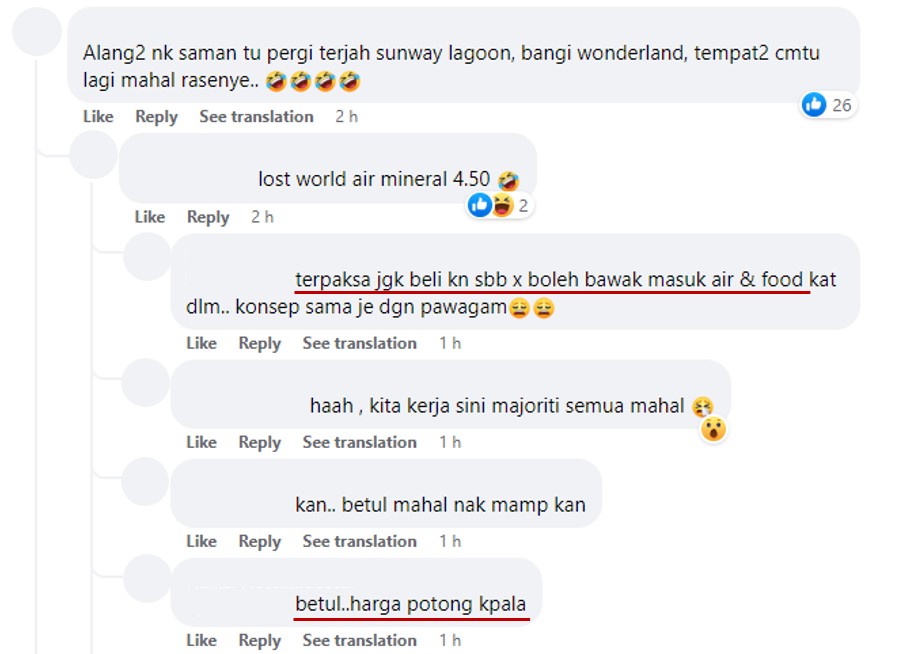 另外,也有网民指出,一些水上乐园的矿泉水售价也高达RM4.50,再加上水上乐园和电影院一样,游客是不允许自带饮料和食物进入场内,因此即使饮料价格不合理,民众也只能被迫“砍菜头”。